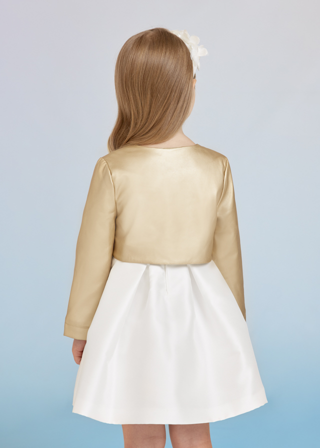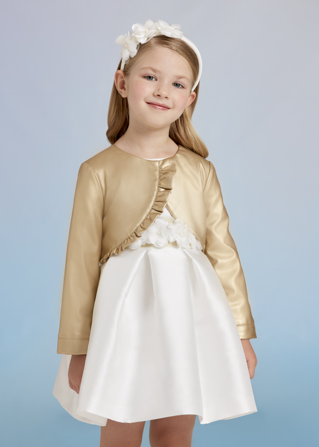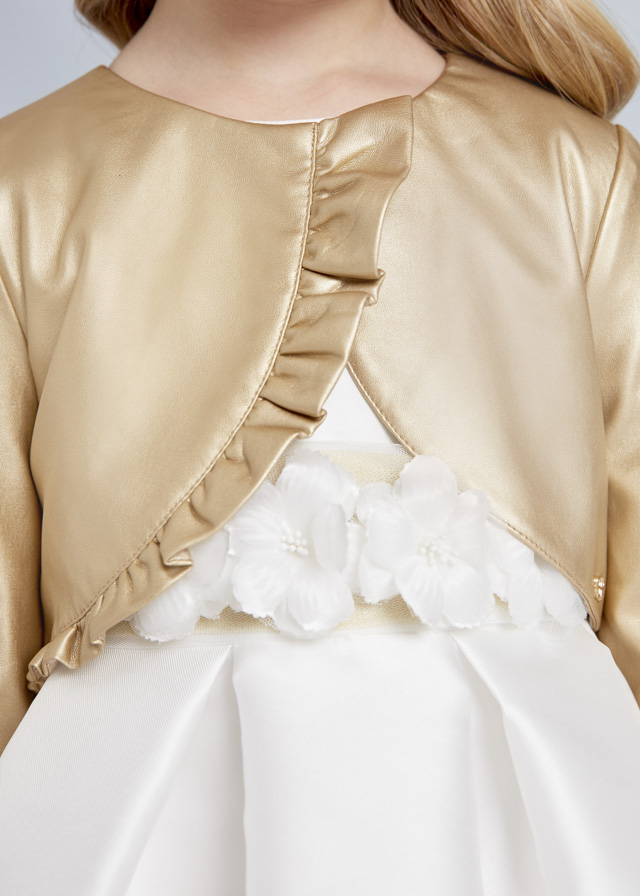 Chaque Abel&Lula de niña para ceremonia de la nueva colección 2023 de Abel&Lula, chaqueta fantasía volante en color champan complemento ideal para completar tu look. Rebeca niña.