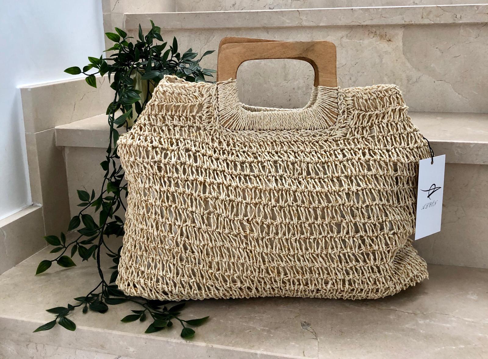 Bolso de esparto con agarradera de madera. Lleva forro interior y no transparenta.