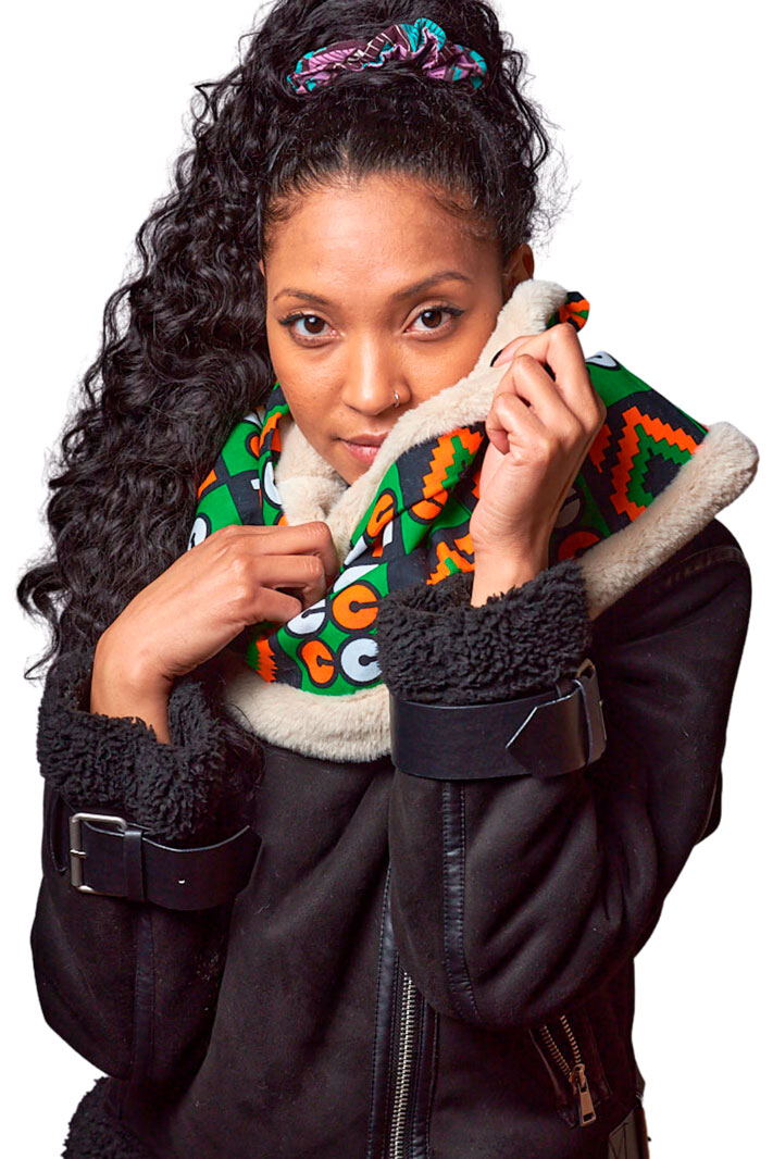 Bufanda de tela de piel caliente totalmente recubierta en tela wax, tela africana 100% algodón. La combinación de la piel sintética con la tela africana crea una textura y un aspecto visual interesante que puede llamar la atención de cualquiera. Cierre con botón de palanca de madera y la gama de colores de la tela africana le da un toque moderno. Ideal para climas moderados a más fríos con vientos fuertes.