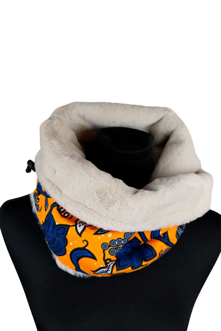 El snood de piel sintética recubierta de tela africana es una prenda de moda muy popular en la actualidad. Este accesorio se utiliza para proteger el cuello y la cabeza del frío, al mismo tiempo que se añade un toque elegante y sofisticado a cualquier atuendo. La piel sintética proporciona una sensación suave y cómoda, mientras que la tela africana estampada aporta un toque de autenticidad y originalidad.