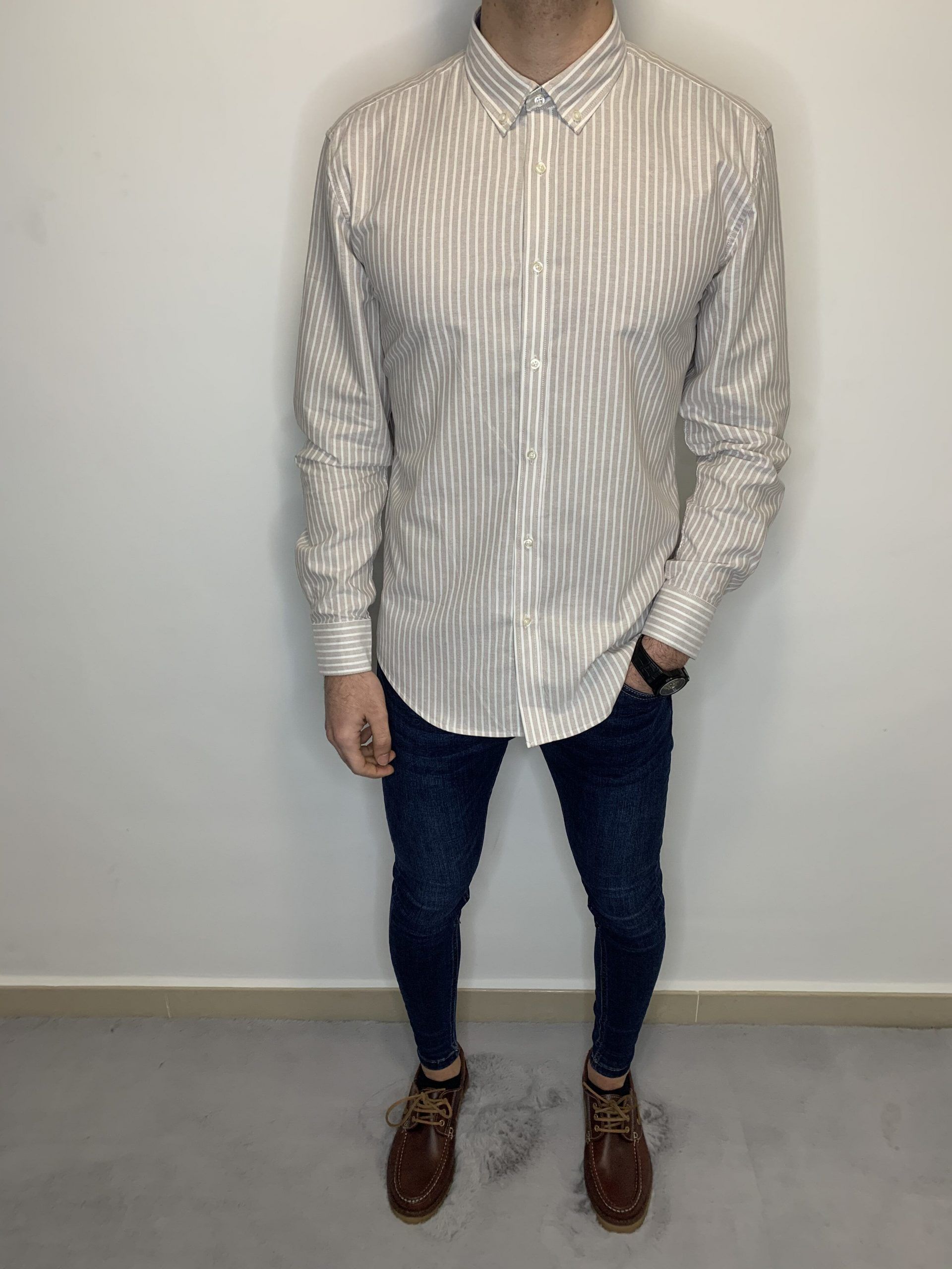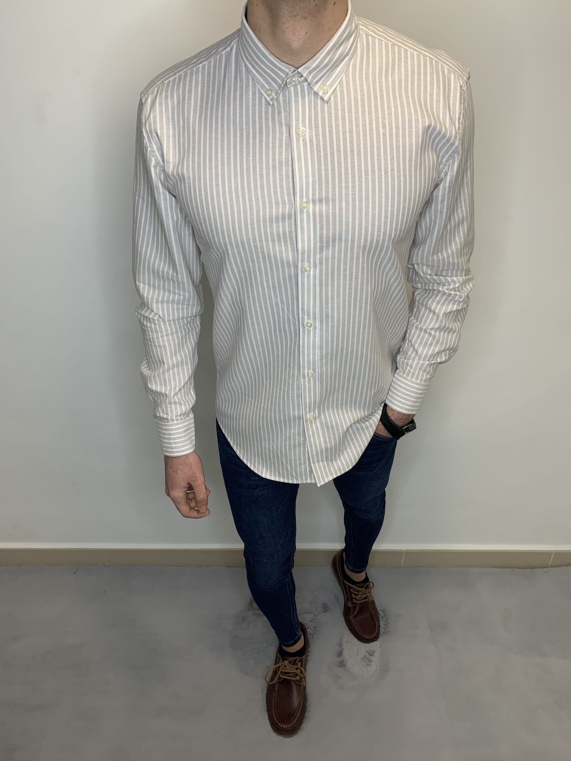 Camisa de rayas blancas y grises con botones y puño ajustable.