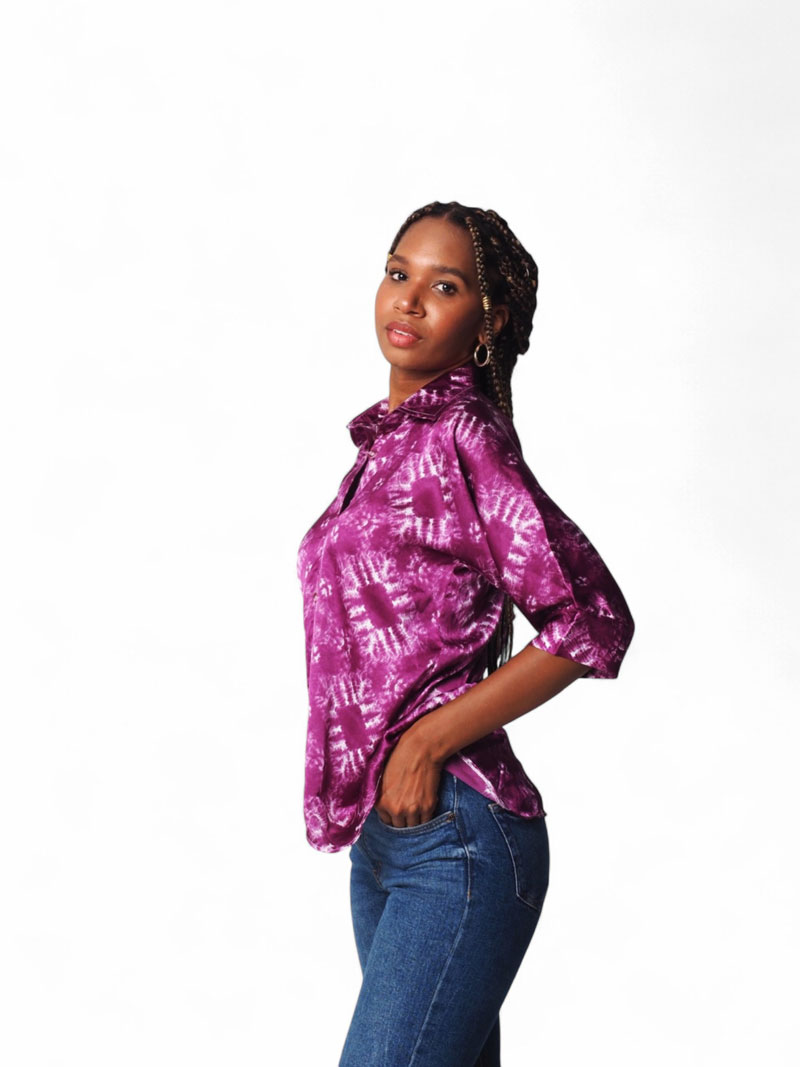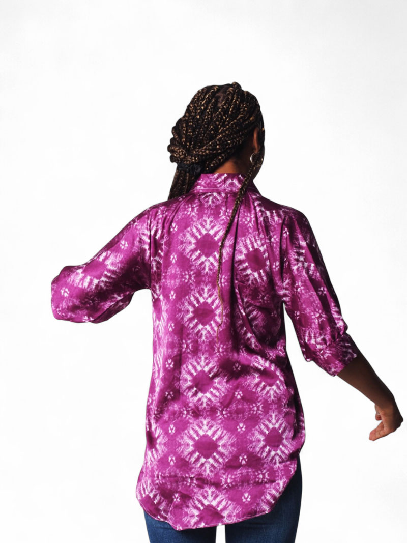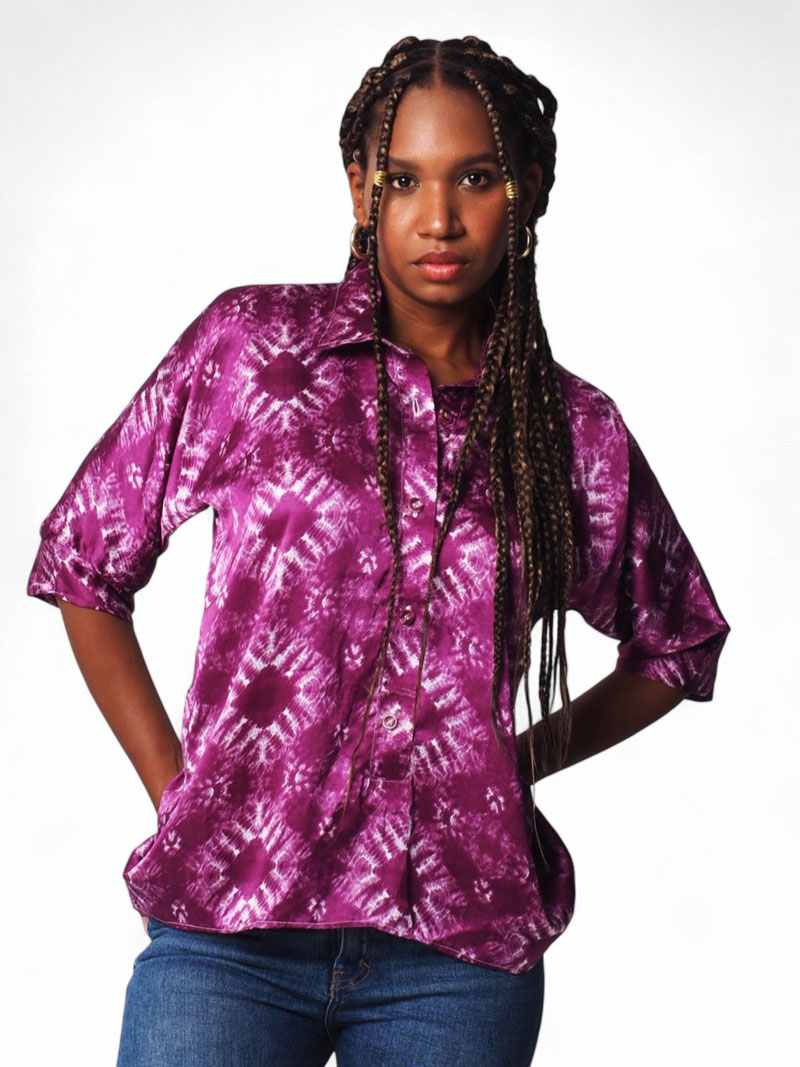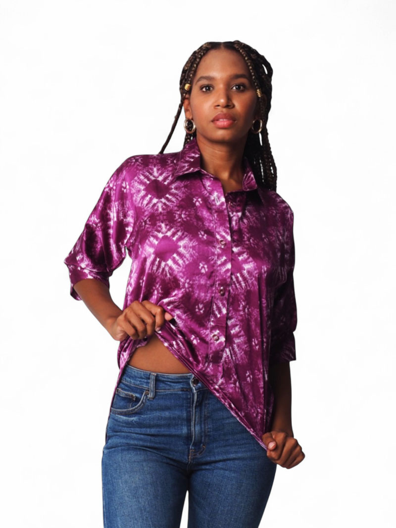 Camisa lila con estampado degradado irregular. Tela fluida y suave, diseño moderno y artístico. Ideal para looks frescos y originales.
