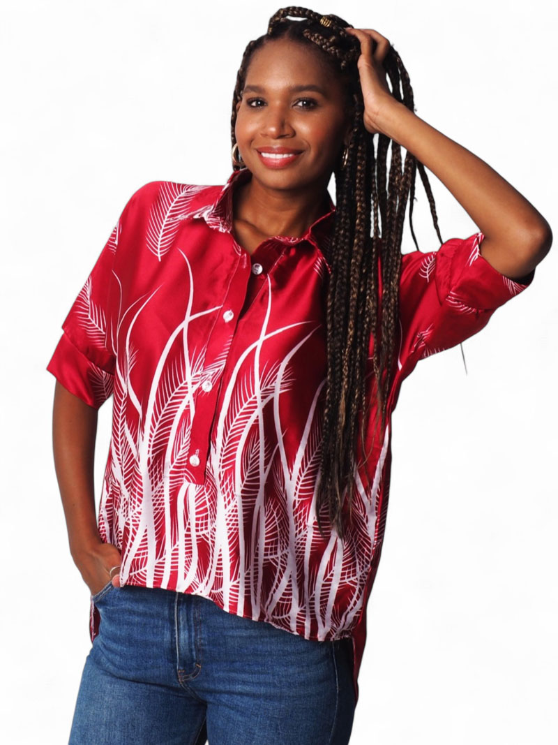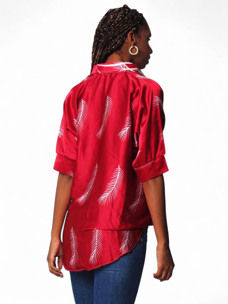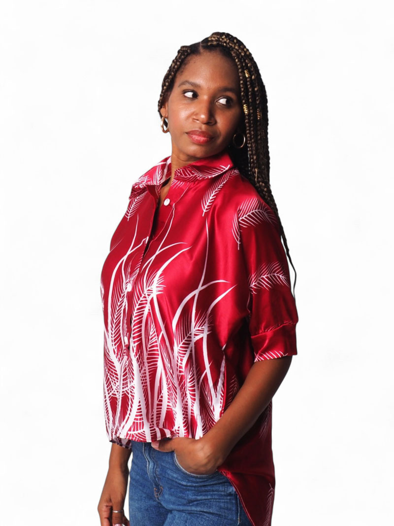 Camisa en tela satinada roja con palmeras. Suave, brillante y de corte cómodo. Ideal para un look tropical, elegante y lleno de estilo.