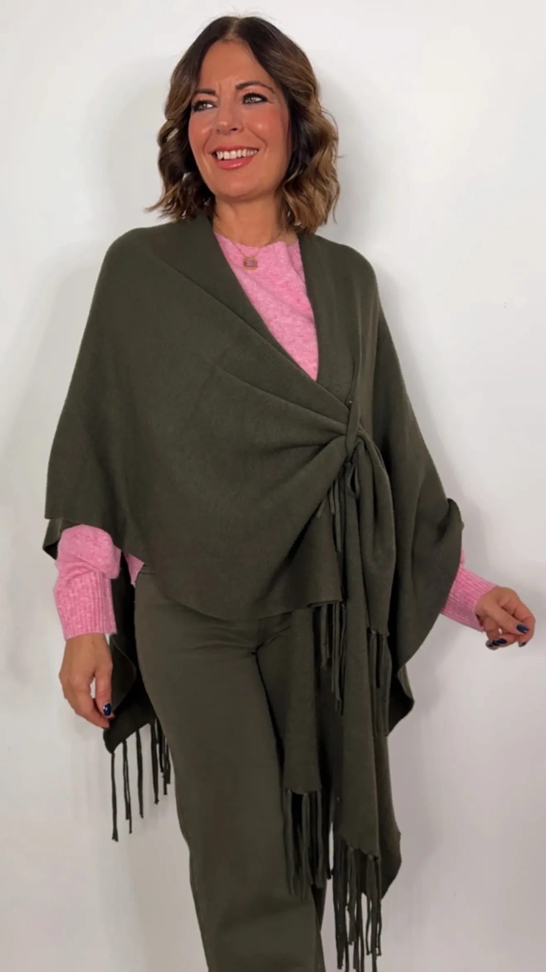 Capa de punto con flecos VERDE KAKI