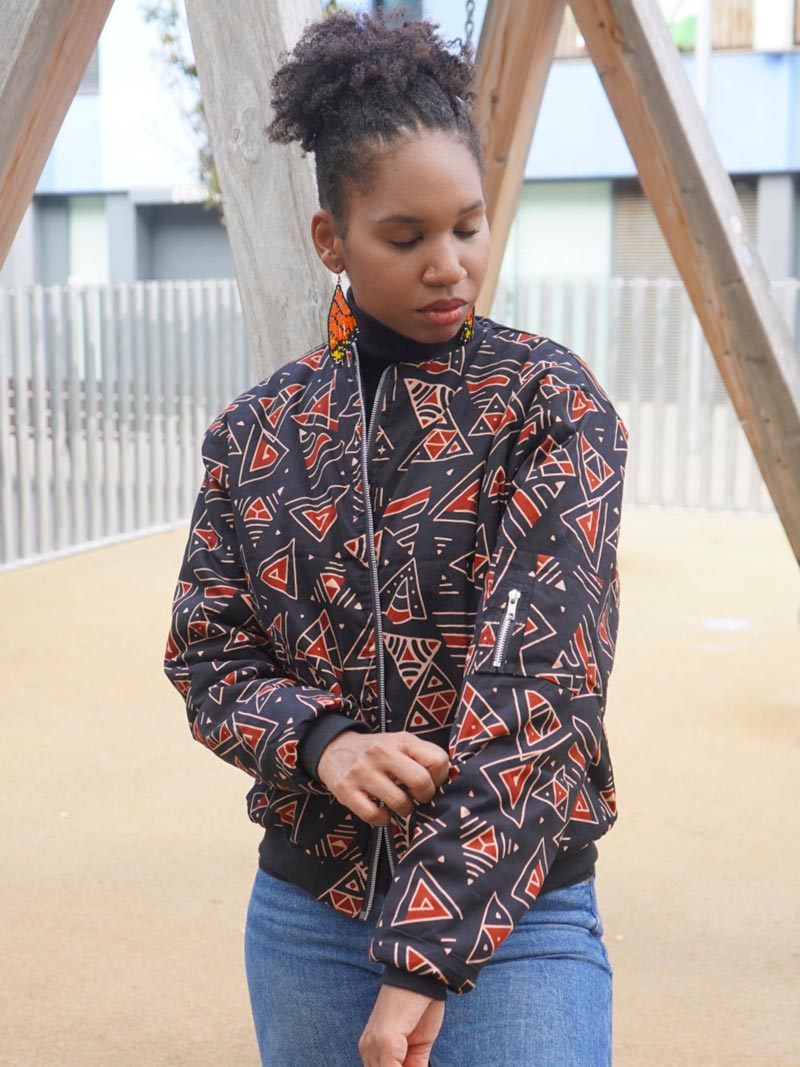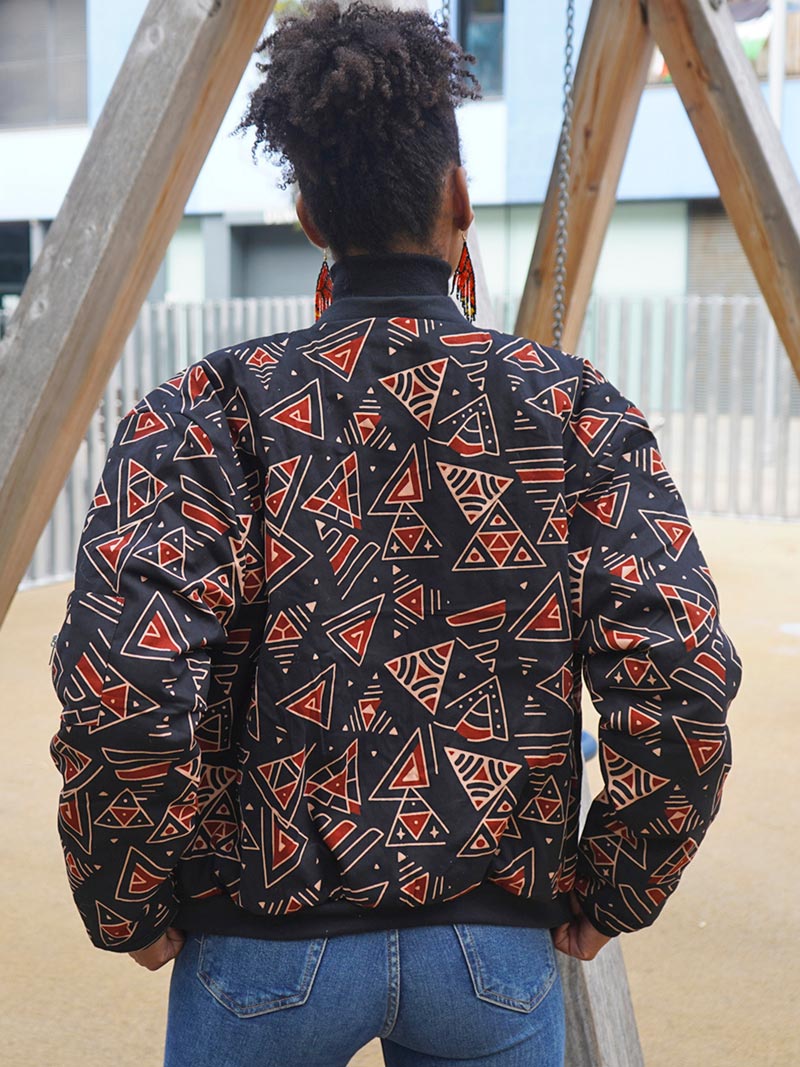La Chaqueta Bomber Africana Ancestral Geometry combina geometría ancestral y moda urbana. Hecha a mano en tela wax, es un diseño unisex elegante y con carácter de Afrika Color.