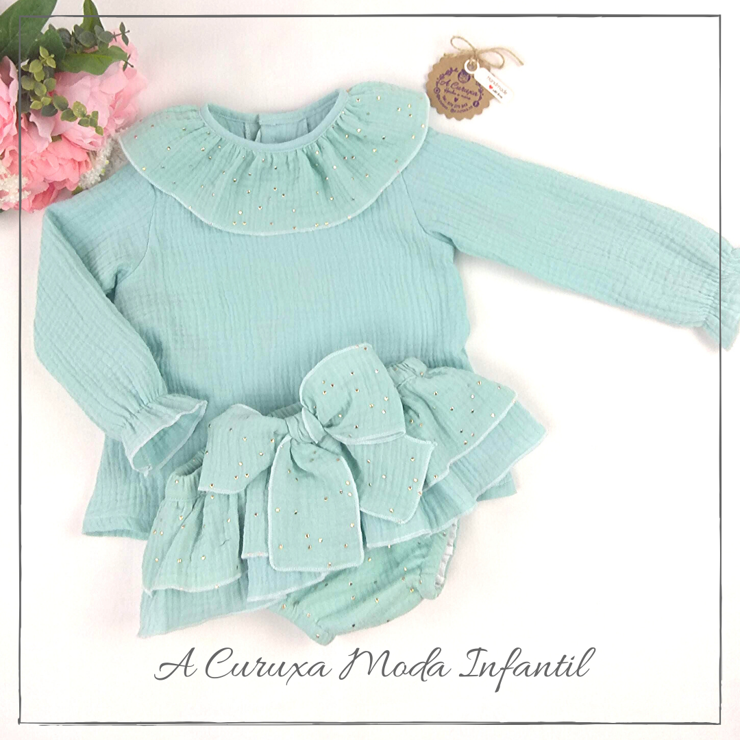 Precioso cubrepañal con dos amplios volantes confeccionados con una combinación de tejido de doble gasa verde mint con topos dorados y liso, adornado con un lazo delantero. Para cualquier otro color consúltanos.