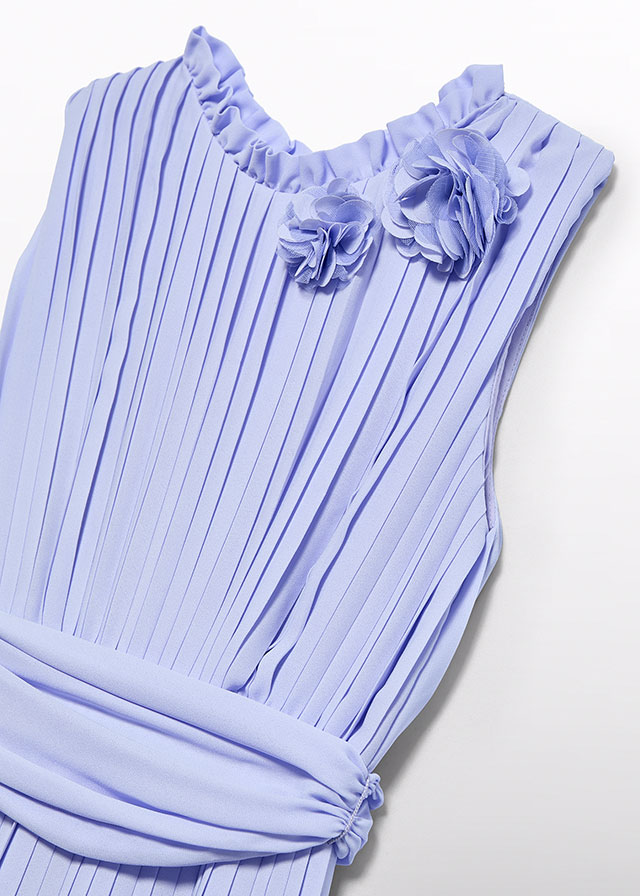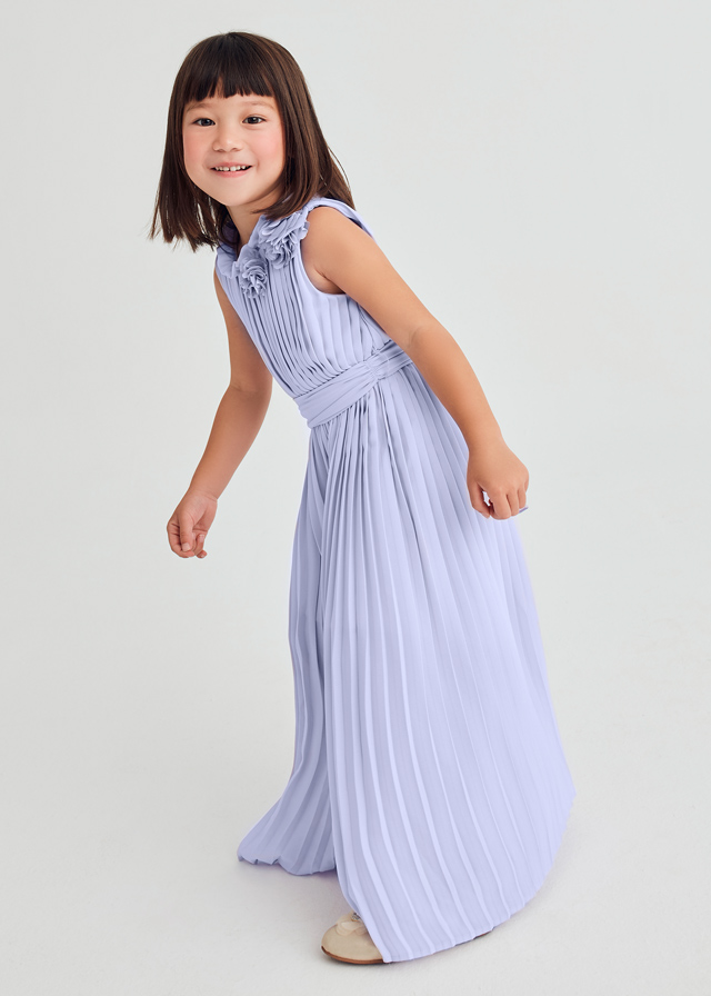 Mono largo de ceremonia juvenil para niña modelo 5223 de la nueva colección Abel Y Lula para esta primavera verano 2025, confeccionado en crepé plisado color lila.