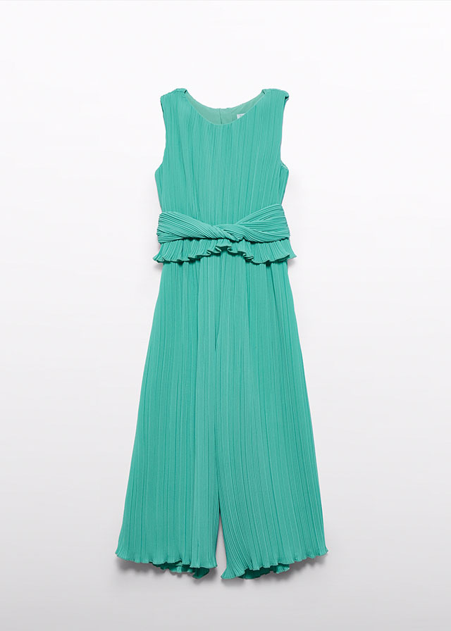 Mono largo de ceremonia juvenil para niña modelo 5221 de la nueva colección Abel Y Lula para esta primavera verano 2025, confeccionado en gasa color aloe. Tallas desde la 10 a la 16.