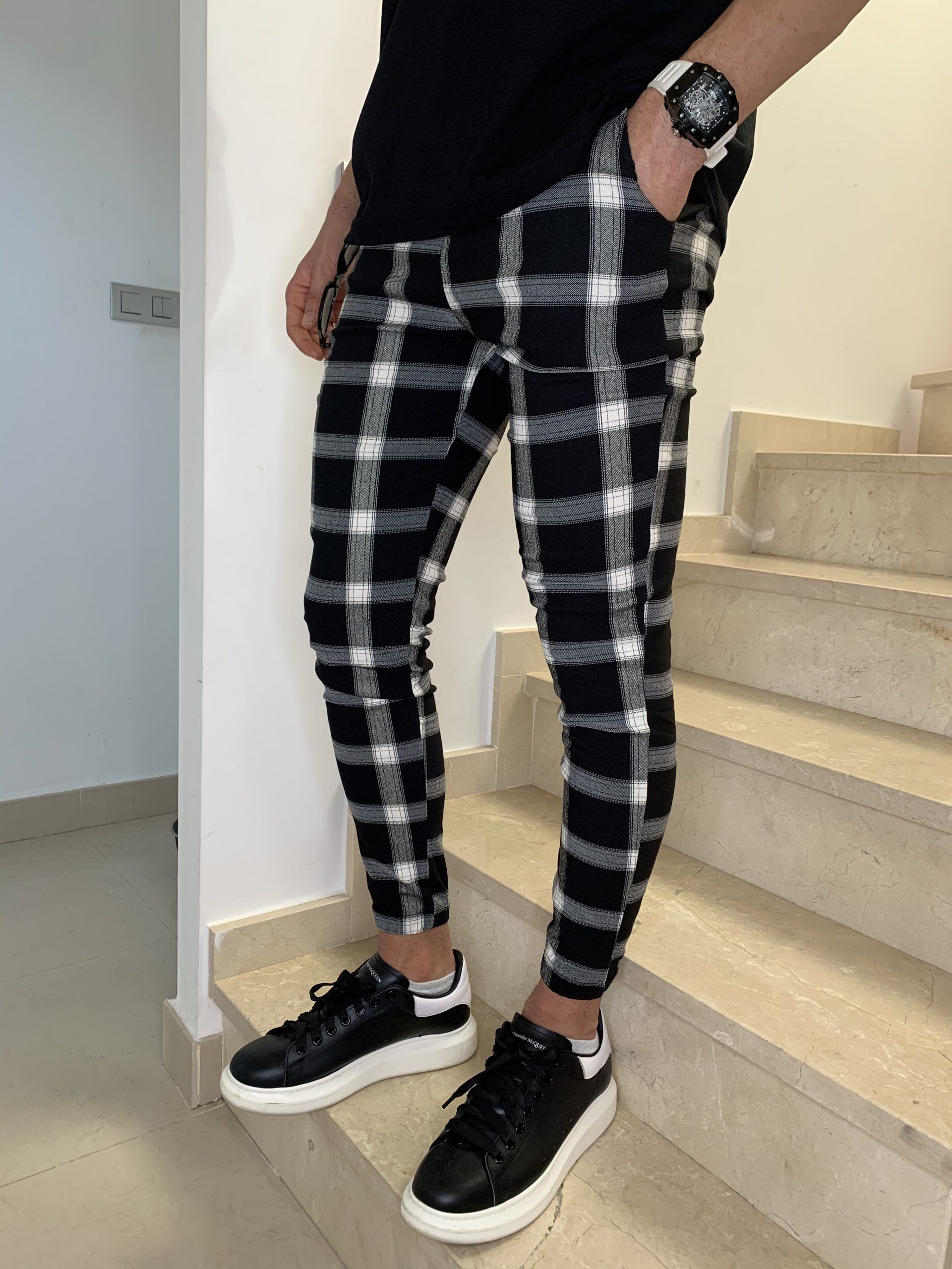 Pantalón pitillo con estampación de cuadros blancos y negros
