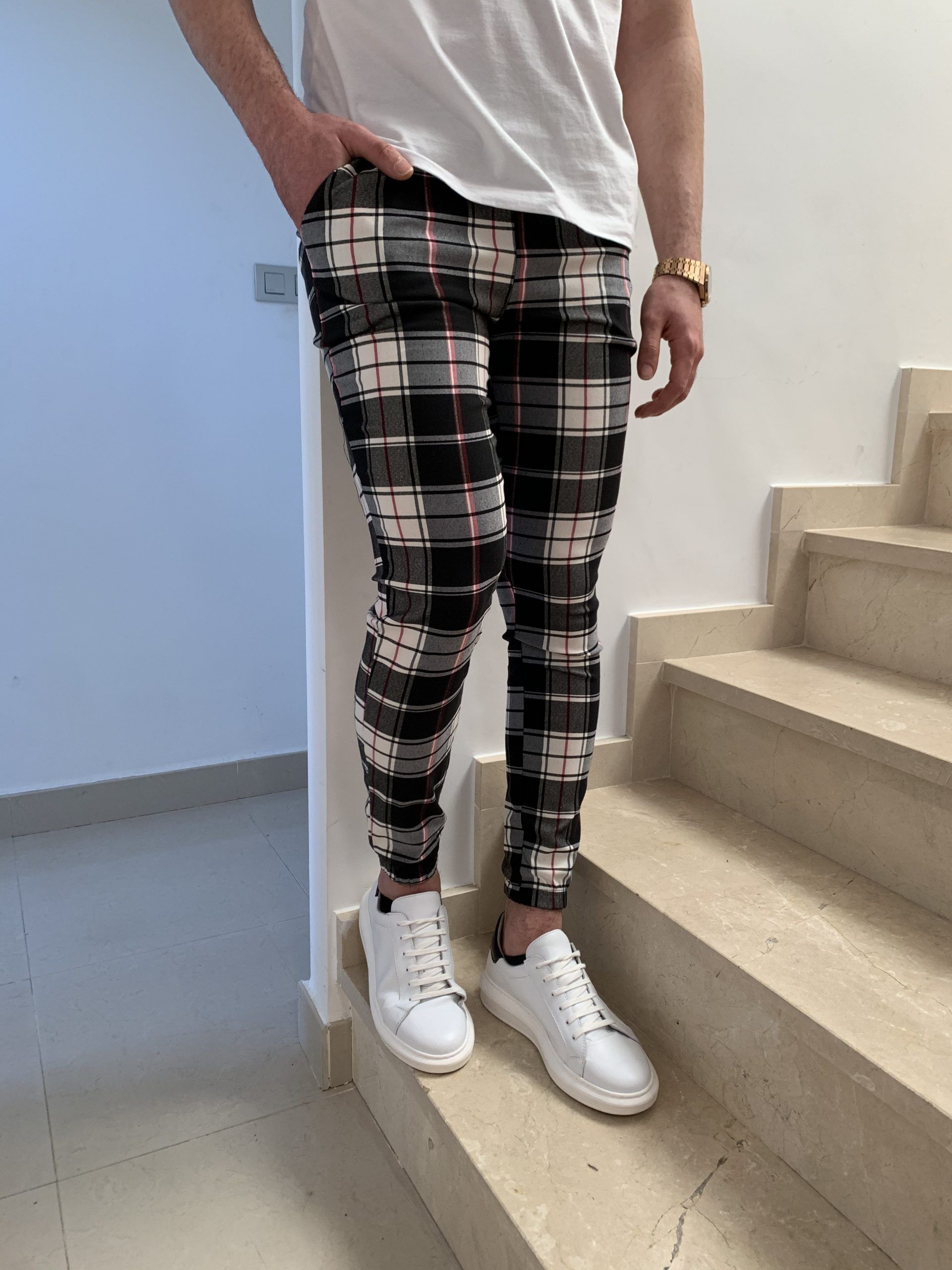Pantalón pitillo con estampado de cuadros blanco y negro. Detalle raya rosa