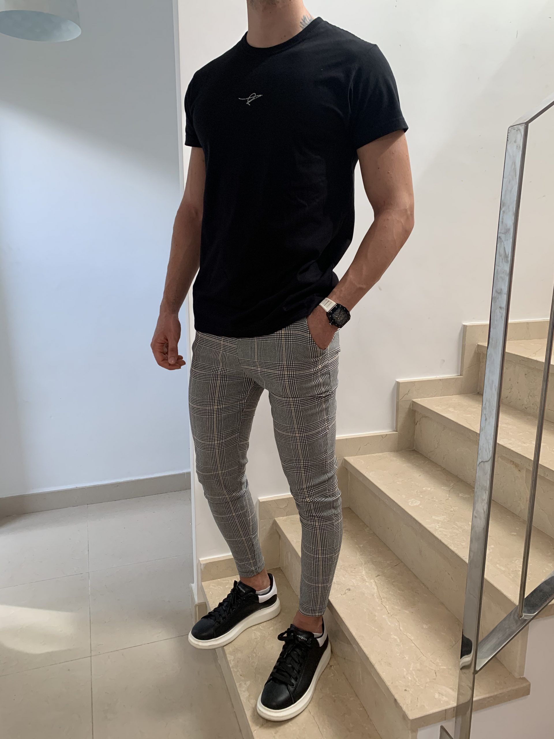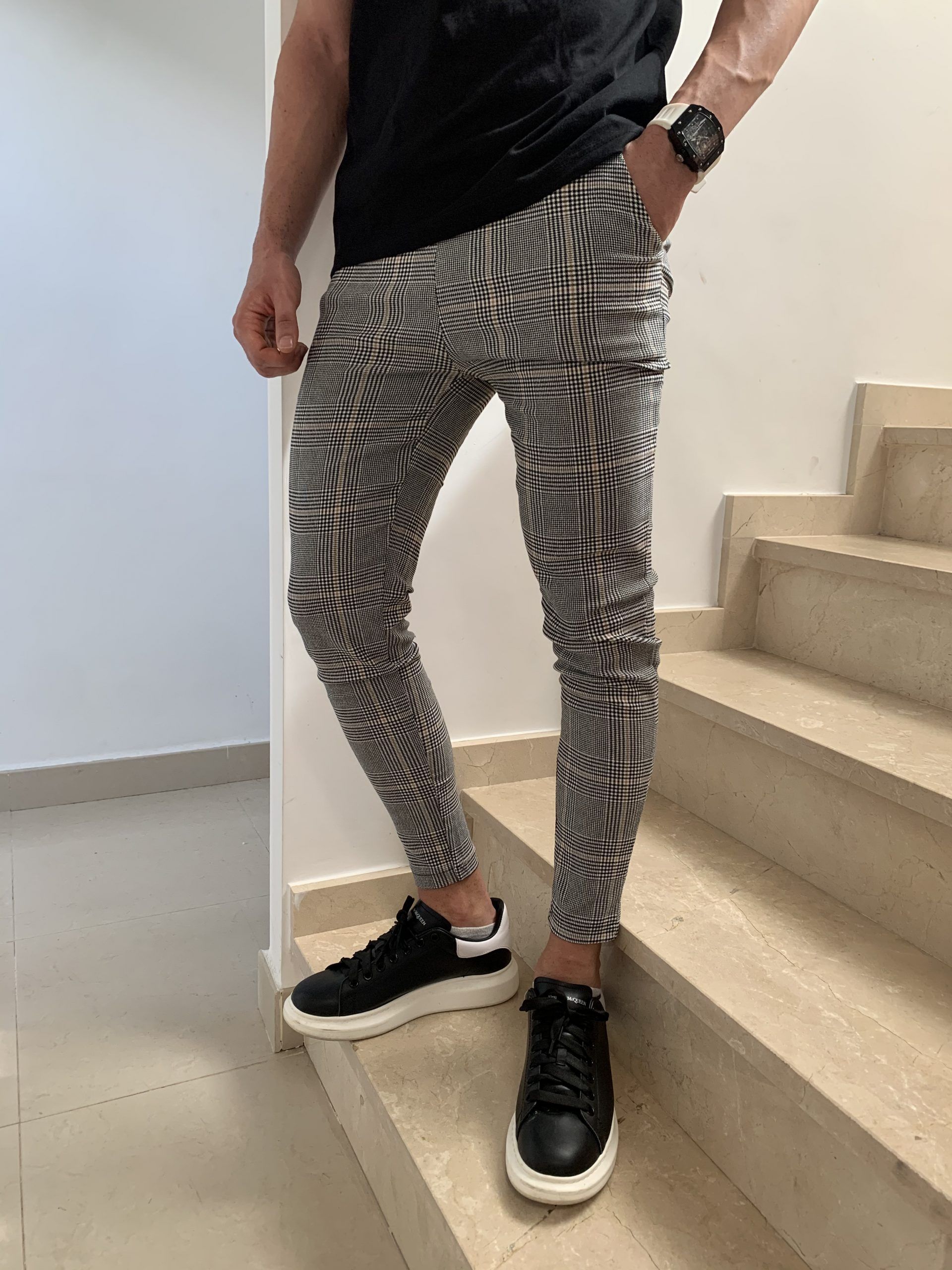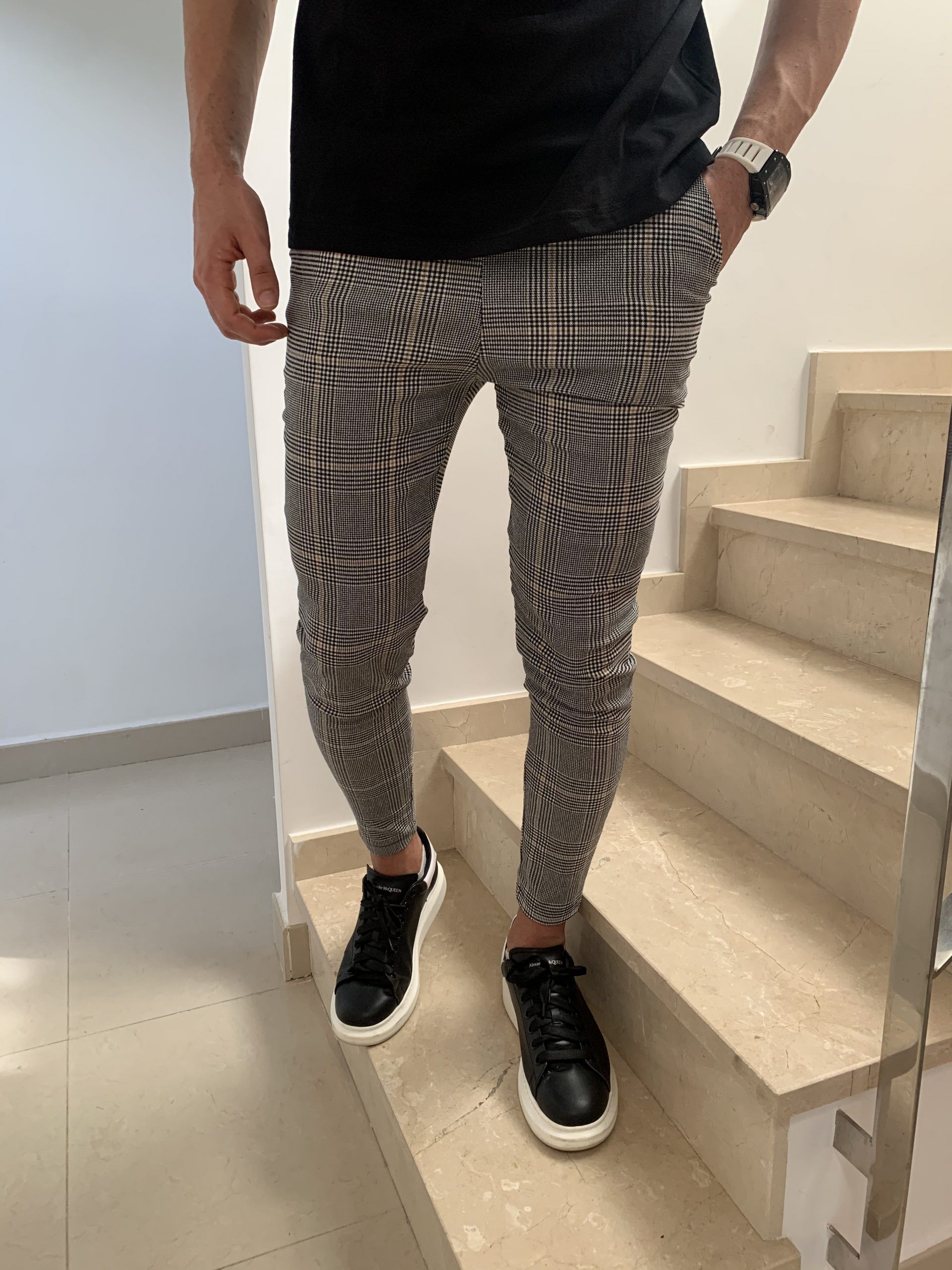 Pantalón pitillo con estampado de cuadros y detalle amarillo