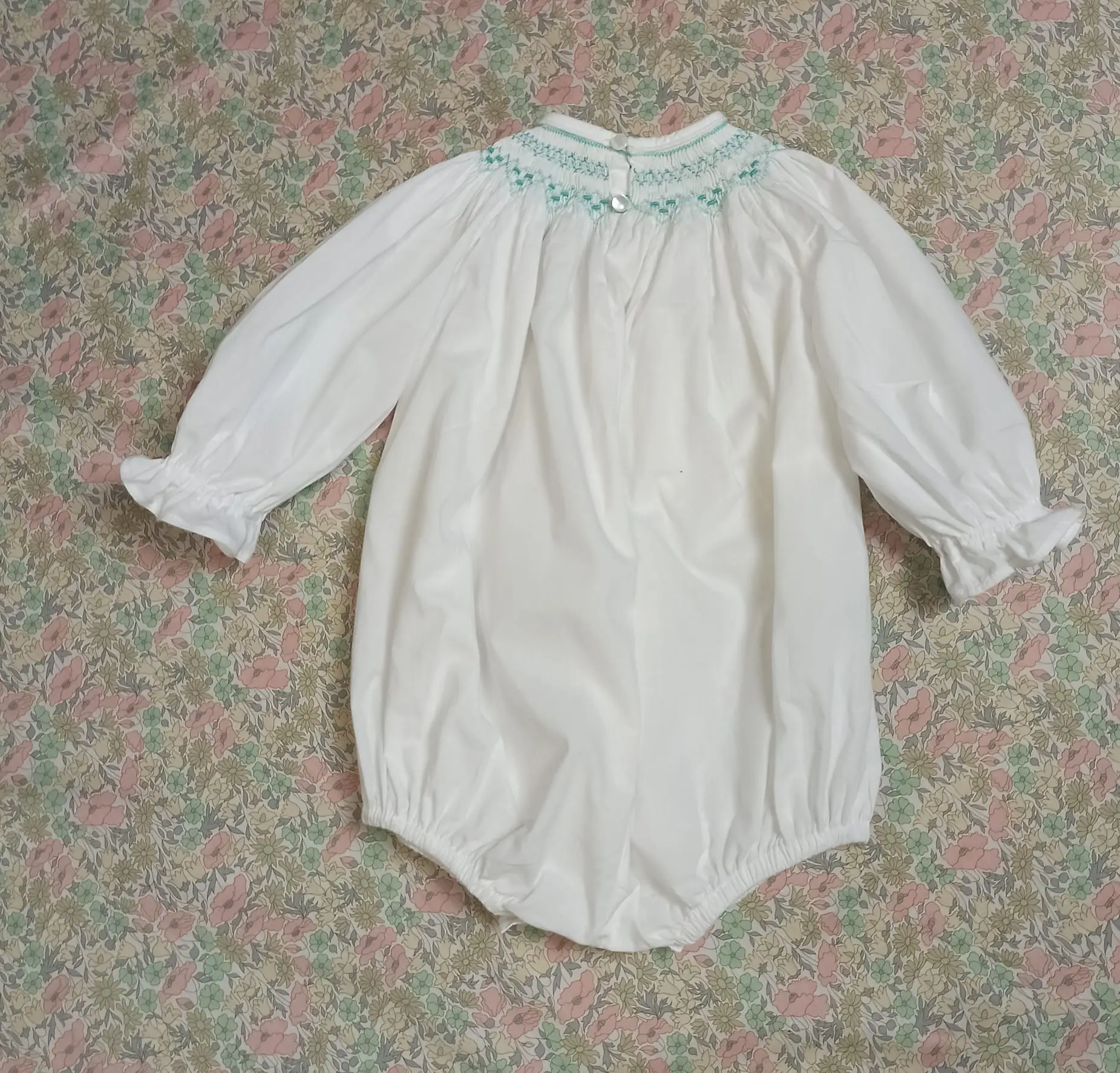Pelele “Bubble”, confeccionado con la tejido 100% algodón y decorado con punto smock, también conocido como nido de abeja o punto inglés.