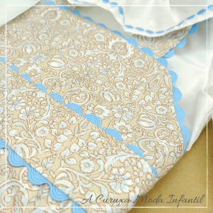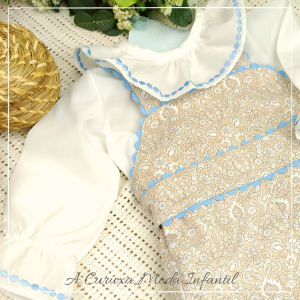 Precioso peto confeccionado en viyela en beige con estampado blanco, adornado con detalles en azul celeste.