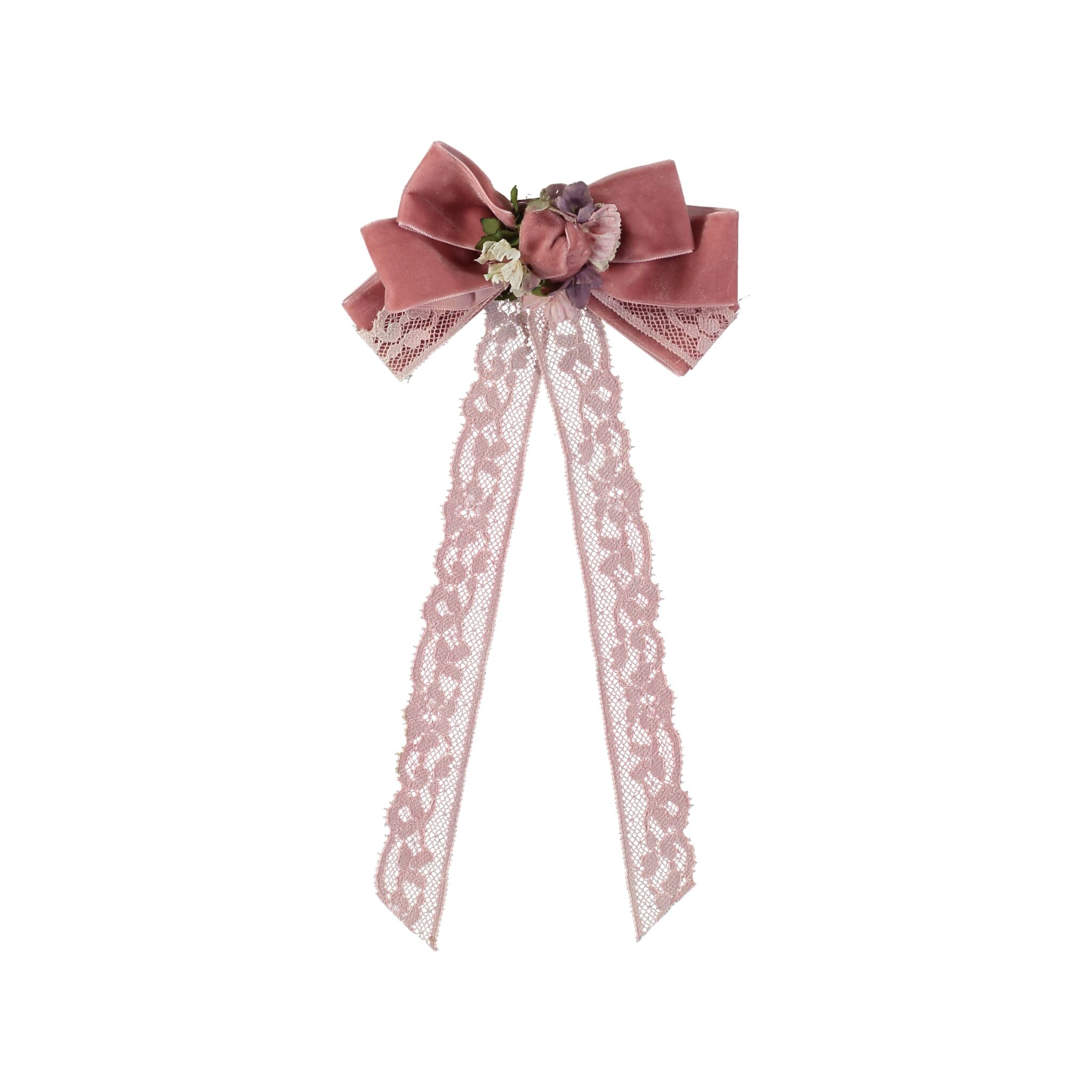 Tocado de comunión-ceremonia. Tocado de flores combinadas en color rosa, con puntilla, de la marca Miss Garland.