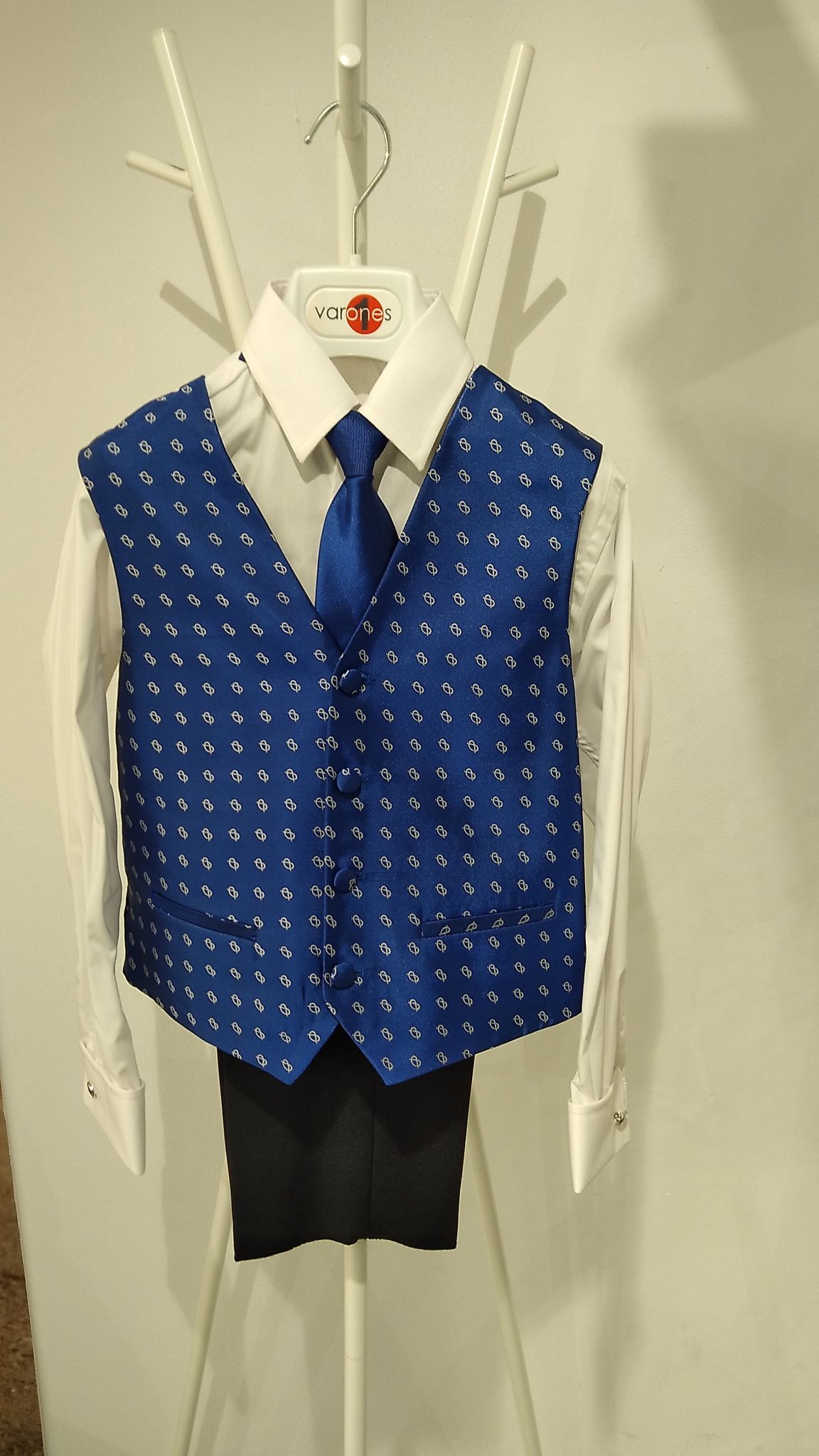 Traje de comunión de la marca One-Varones modelo Almirante color marino. Este traje esta compuesto de chaqueta en marino y cuello solapa pantalón azul marino, chaleco azul, camisa blanca con gemelos y corbata azul marino.