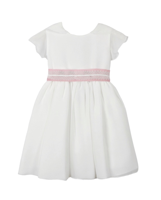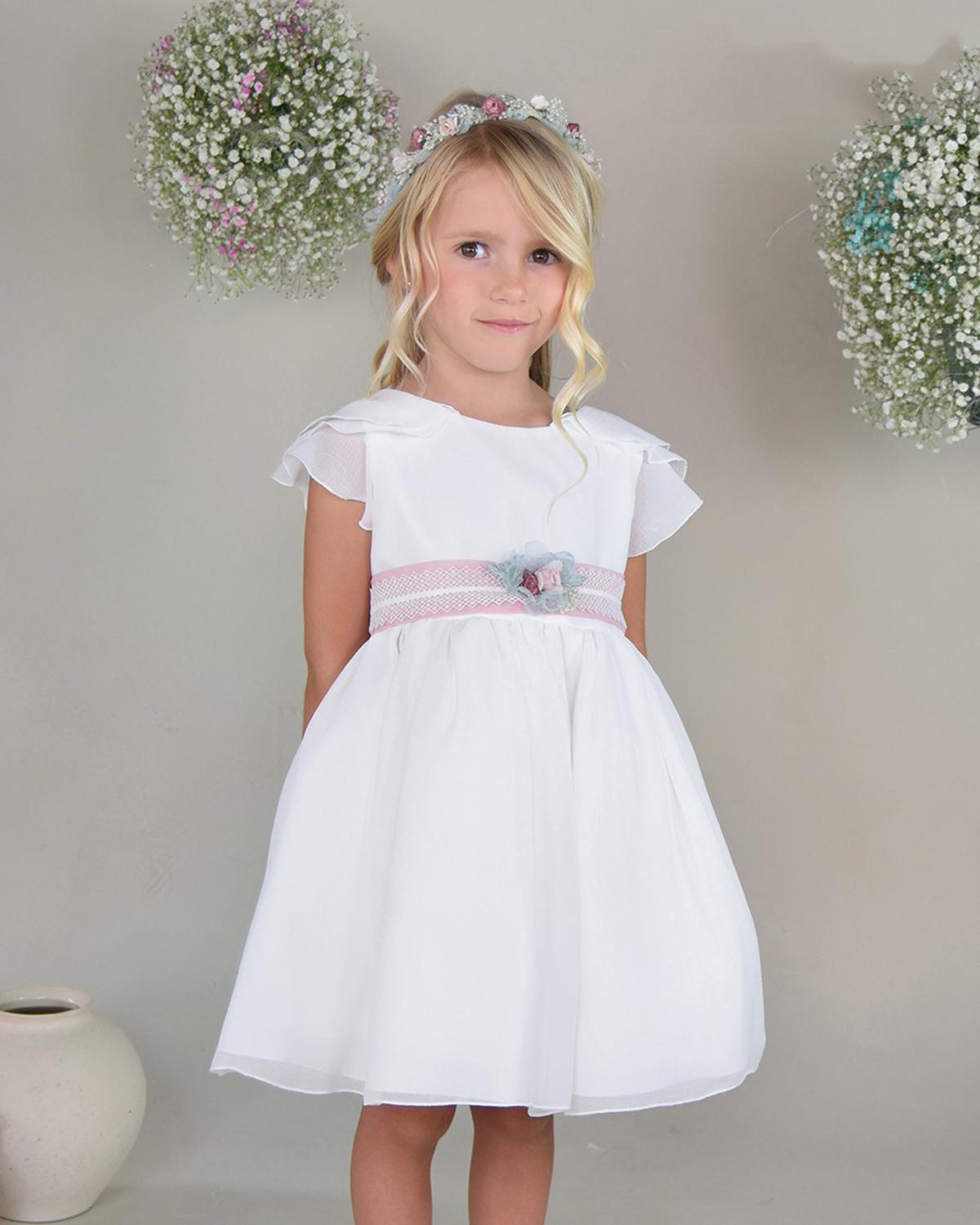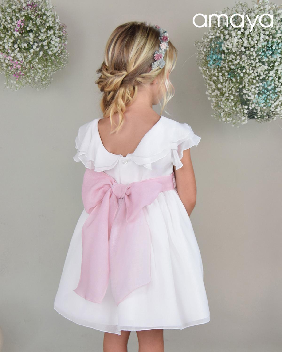 Vestido niña Amaya ceremonia y arras. Vestido ceremonia y arras de niña, confeccionado en tejido de bambula con lazo rosa de la nueva colección verano 2025