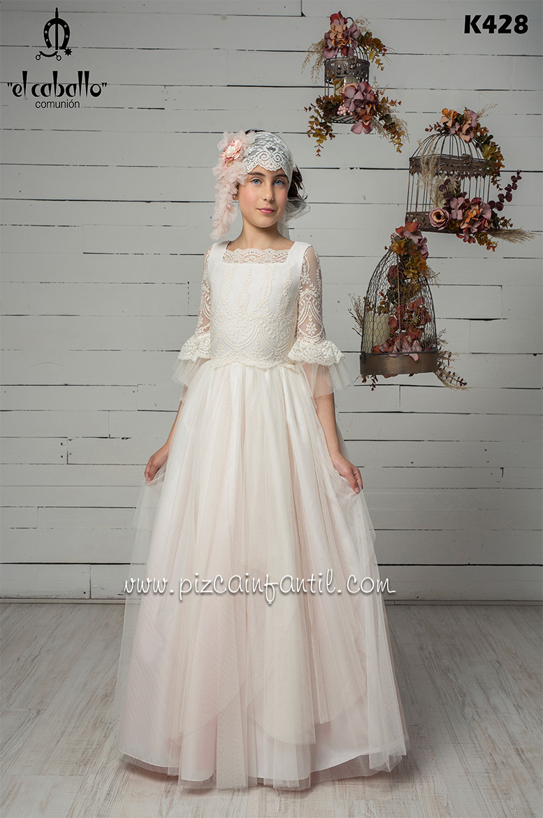Precioso vestido de comunión 2020 de la colección «el caballo». Modelo K428 Vestido de comunión con espectacuar cuerpo de encaje . El encaje hace dibujos en torno a la cintura para simular el efecto de un fajín, manga francesa en el mismo encaje con volante. Bonita falda de tull capeada.
