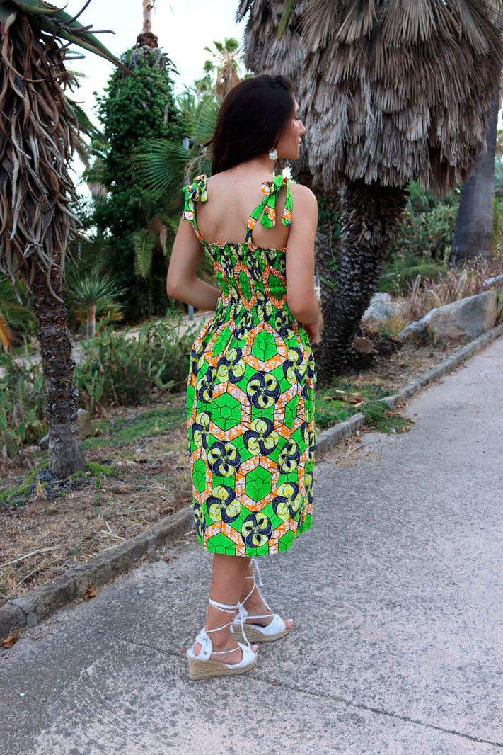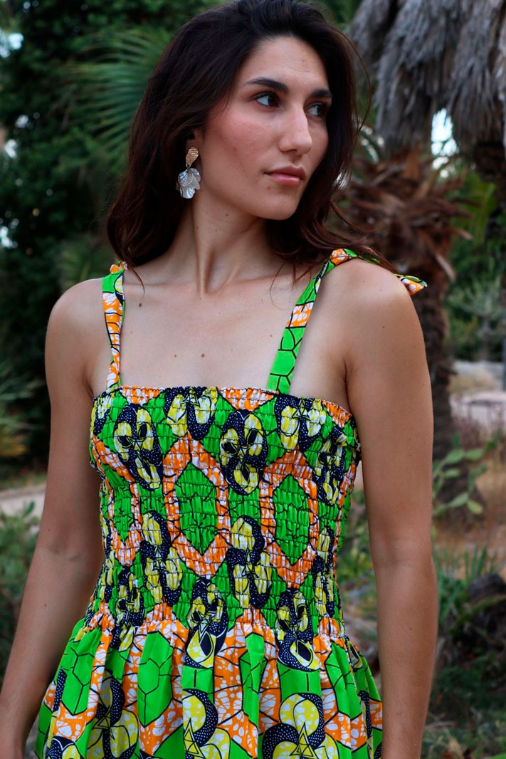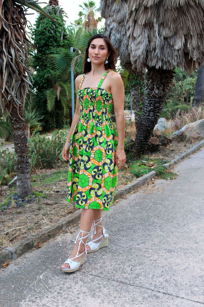 Vestido fruncido estampado geometría de tela africana con corte a la rodilla y sin manga. El vestido estampado en tela africana se puede encontrar en diferentes diseños y estilos. Vestido estampado tela wax 100% algodón.