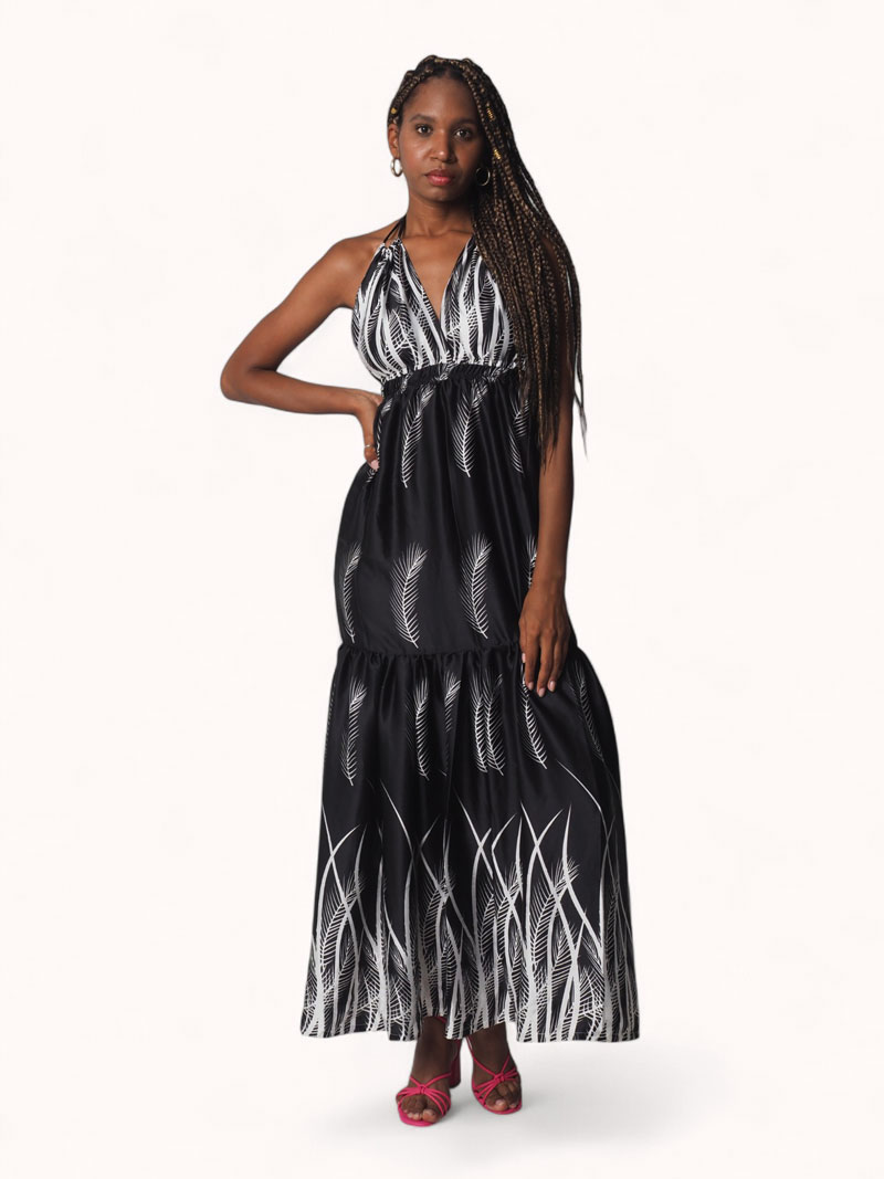 Este vestido largo en tela satinada negra con estampado tropical de palmeras es una pieza icónica que combina elegancia, movimiento y estilo afro-tropical. Diseñado para realzar tu figura y destacar en eventos tanto de día como de noche, es una prenda versátil que no pasa desapercibida.