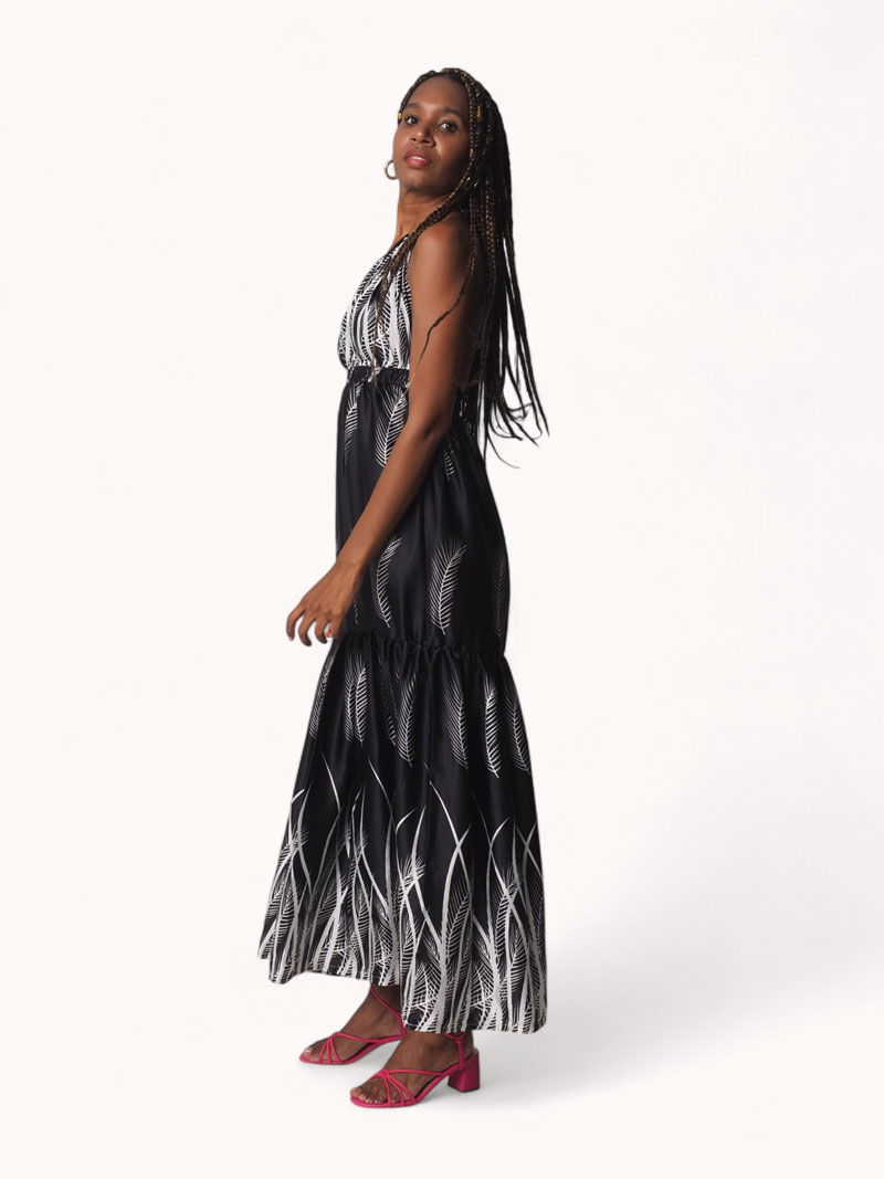Un vestido que fusiona la esencia africana con glamour tropical. Llévalo con accesorios dorados o naturales para completar el look.