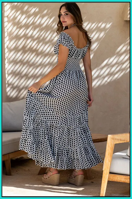 Vestido maxi con 5 volantes en el bajo y escote y mangas adaptables con elástico. cinturilla de nido de abeja. Tejido en polisilk y estampado de lunares en blanco y negro Sunset.