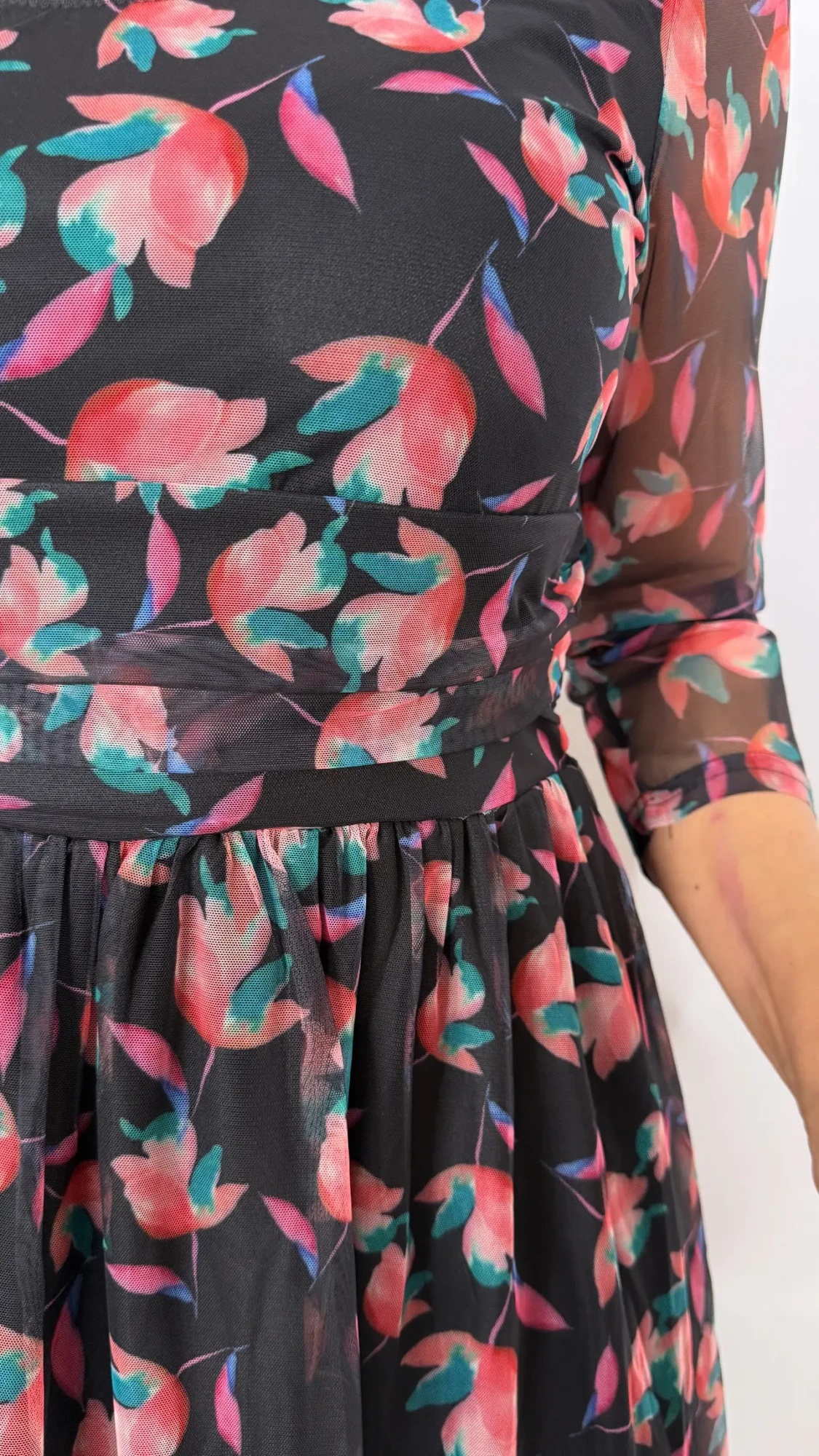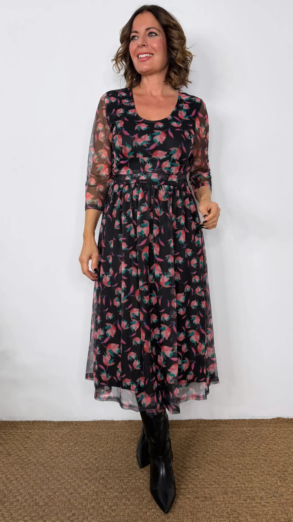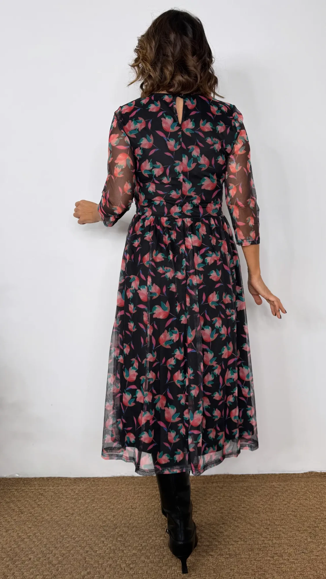 Vestido midi estampado flores con magas de tull Negro – AMAPOLA