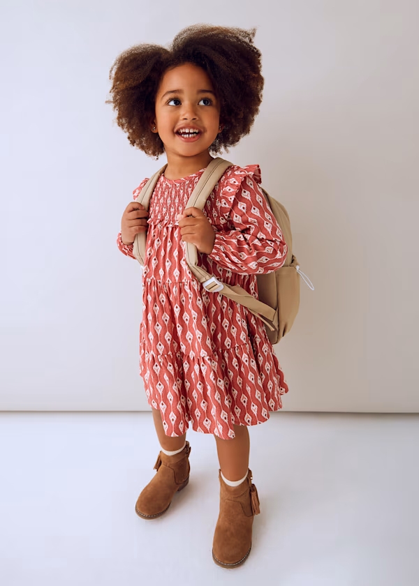 Vestido de manga larga para niña con volantes en los hombros. Cuello redondo. Cierre con un único botón. Tejido cálido ideal para los días más fríos. Este modelo lleva detalles de nido de abeja. Modelo con rizo. Diseño estampado. Entre 2-10 años.