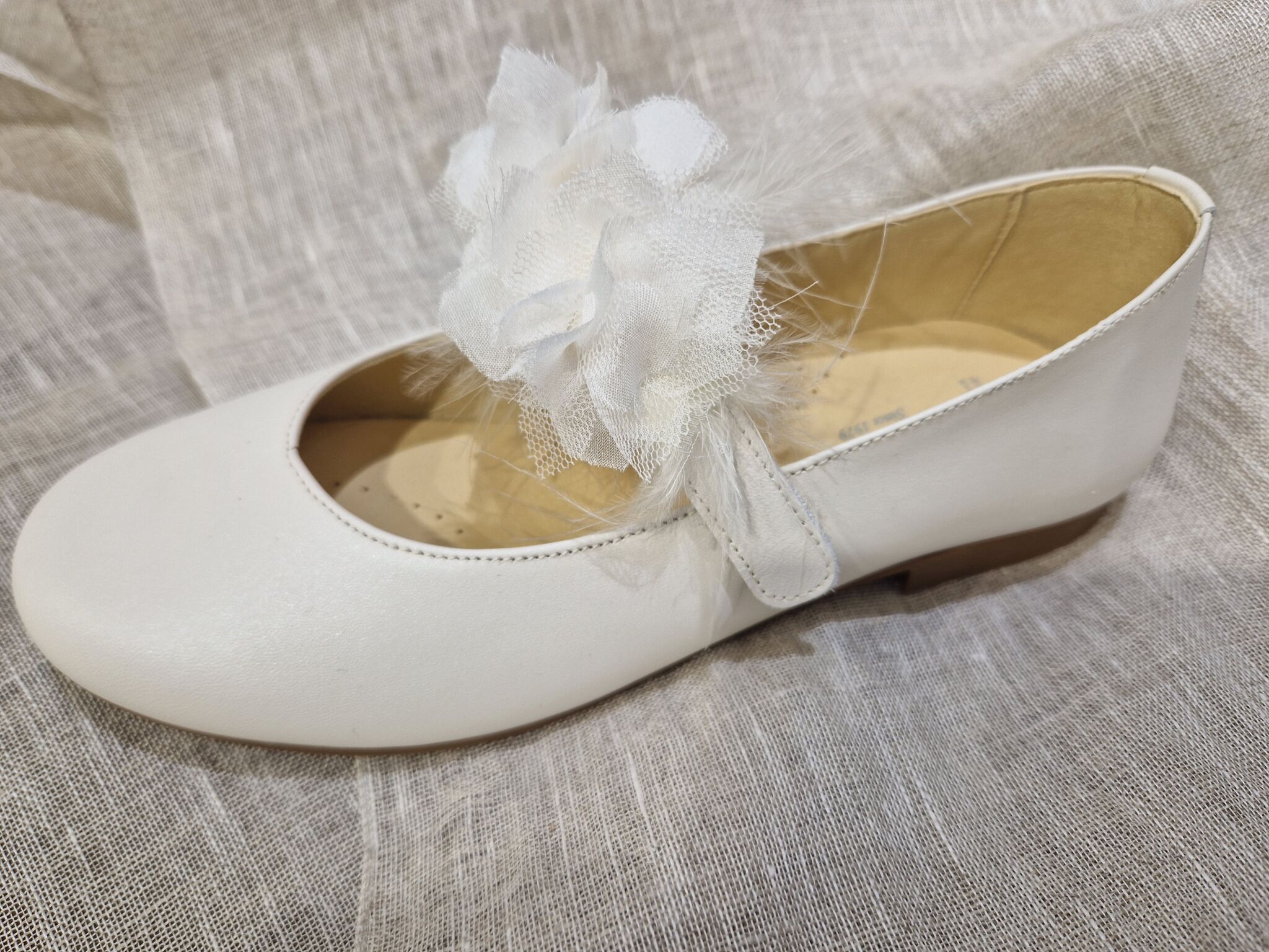 Zapato de niña para comunión o ceremonia en color crudo. Detalle con adorno de flores que se pueden quitar. Zapato suave y cómodo.