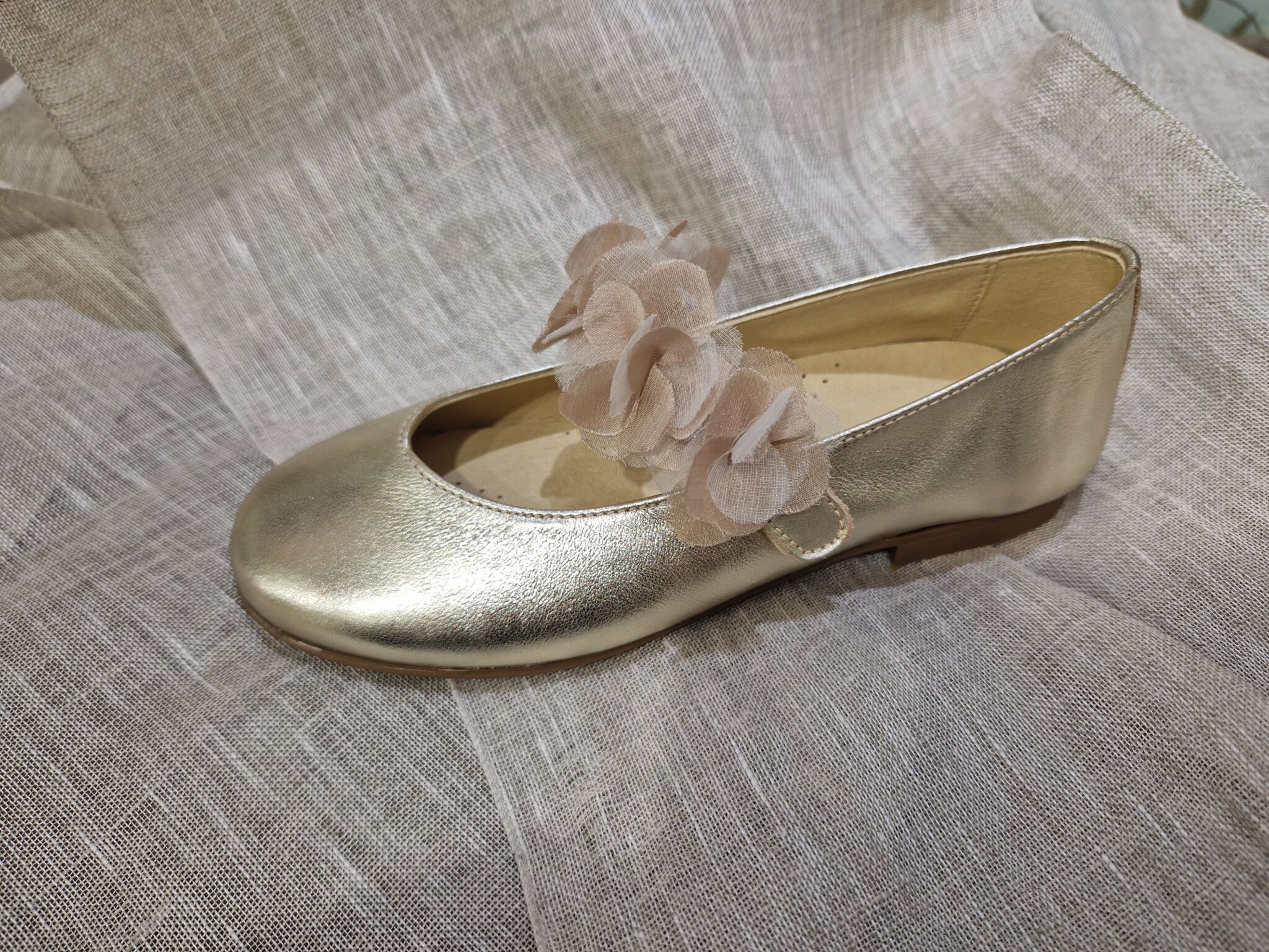 Zapato de niña para comunión o ceremonia en color dorado. Detalle con adorno de flor que se se puede quitar. Zapato suave y cómodo.