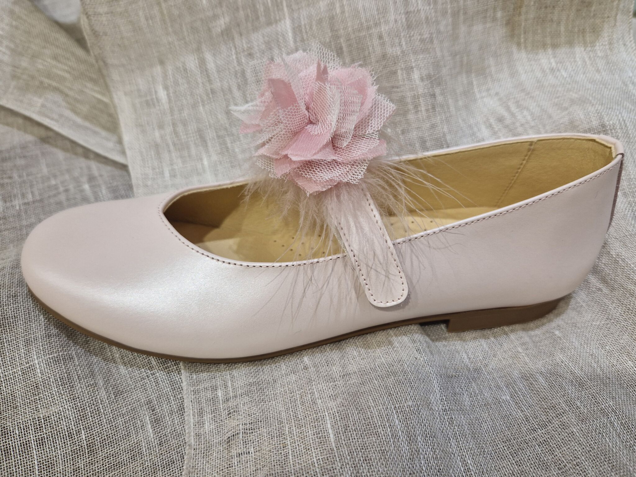 Zapato de niña para comunión o ceremonia en color rosa. Detalle con adorno de flores que se pueden quitar. Zapato suave y cómodo.