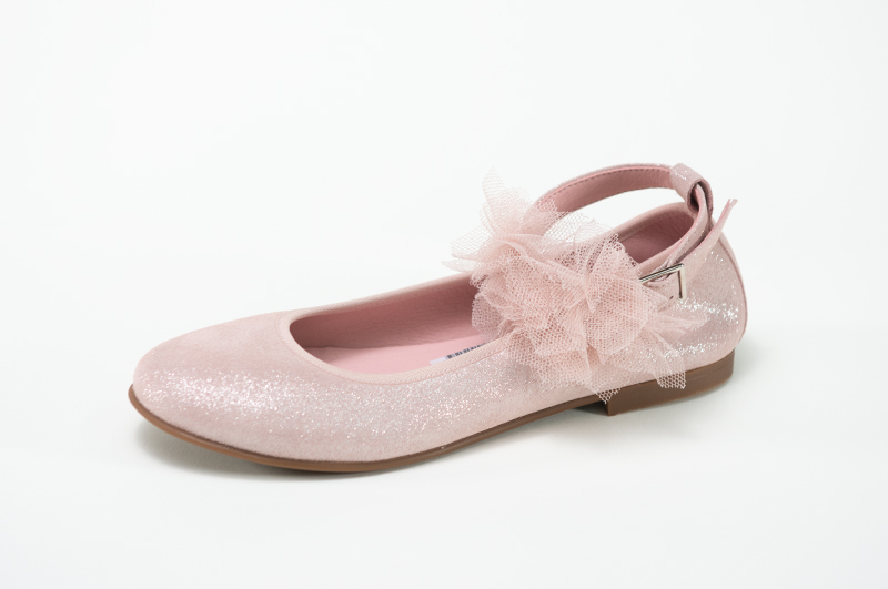 Zapato de niña modelo Kota Landos rosa Interior zapato entero forrado de piel y plantilla. Zapato suave y cómodo. detalle flores en pulsera para atar en tobillo